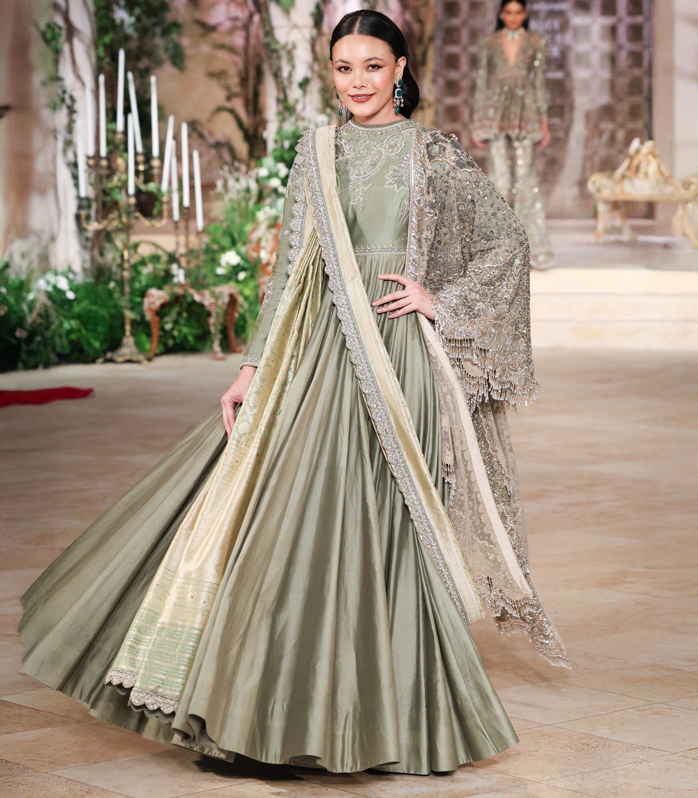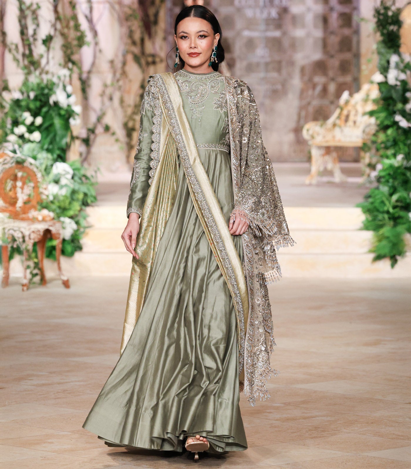 An anarkali paired with a saree and cape, crafted on a silk base and intricately hand-embroidered in zardozi.