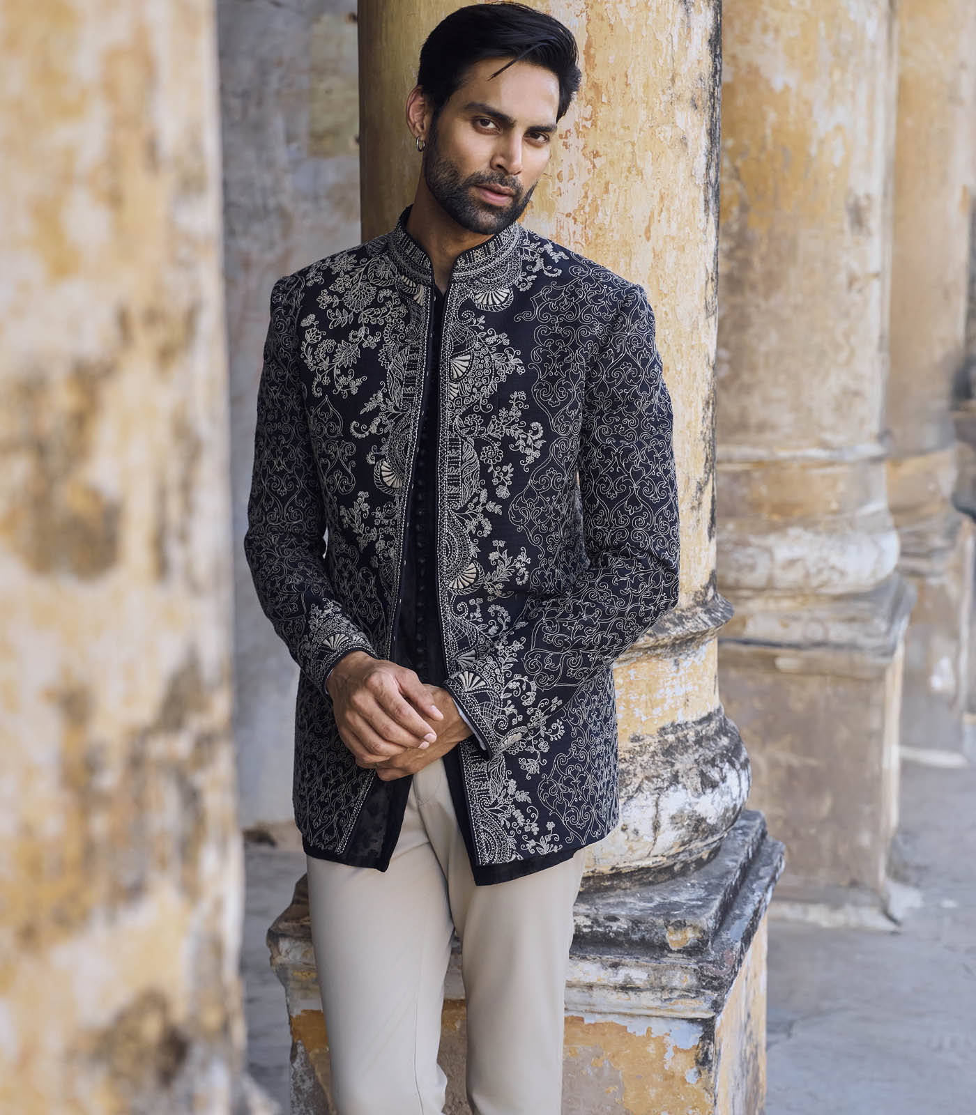 Featuring a raw silk bandgala  with  thread embroidery. It is paired with an plain kurta and trouser.