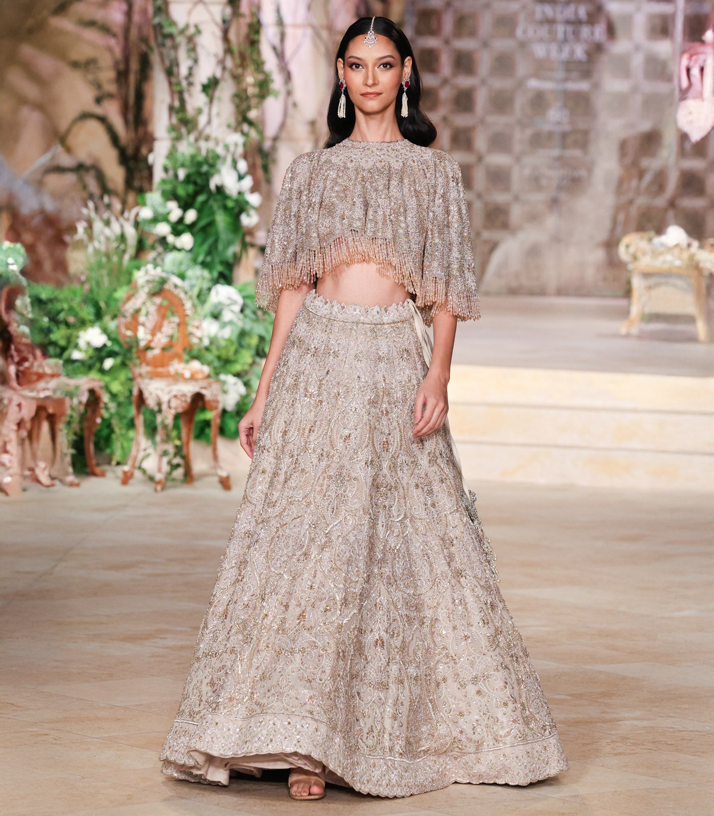 A lehenga paired with a cape, crafted on a organza base and intricately hand-embroidered in gota zardozi.