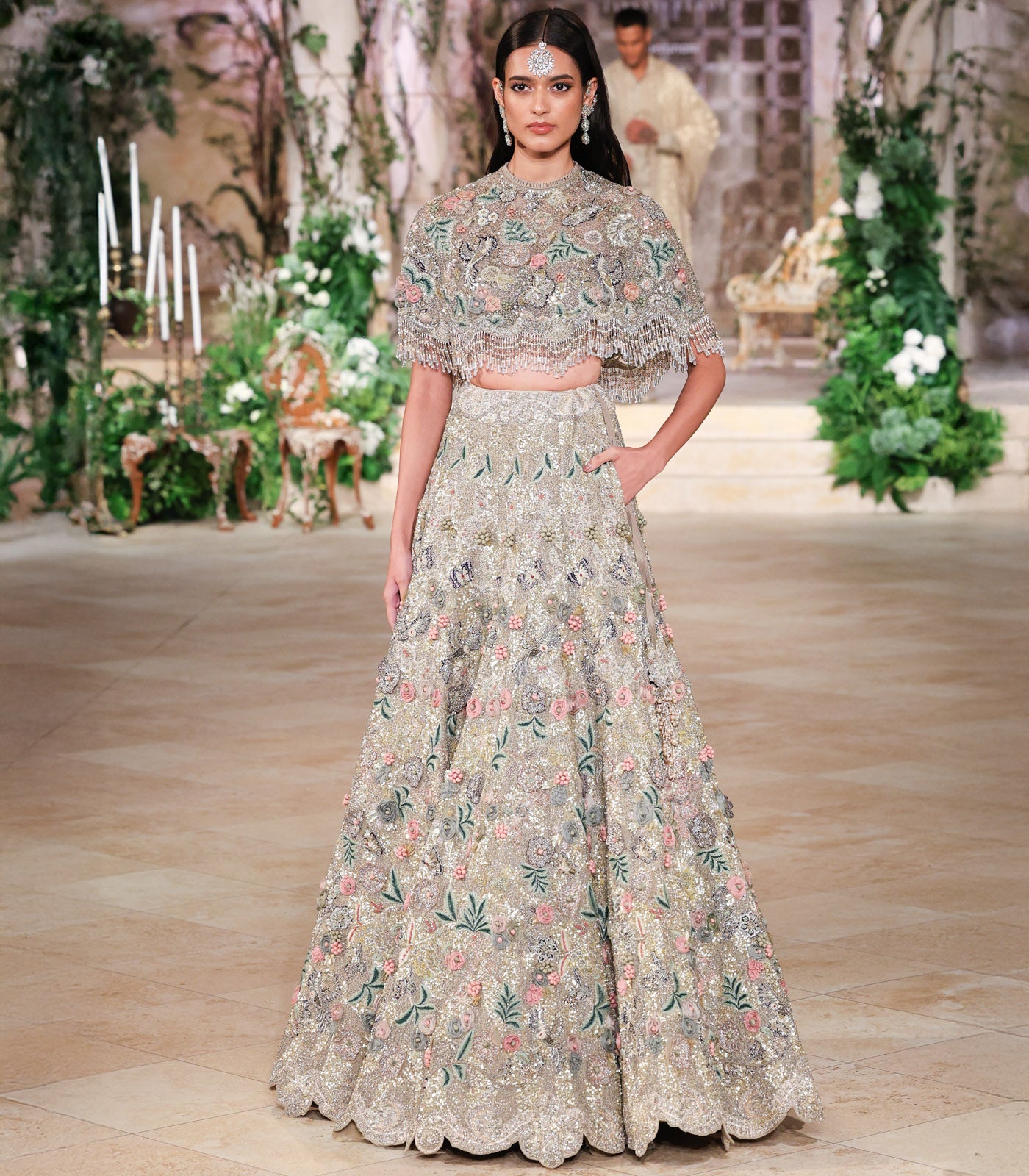 A lehenga paired with a cape, crafted on a organza base and intricately hand-embroidered in sequins.