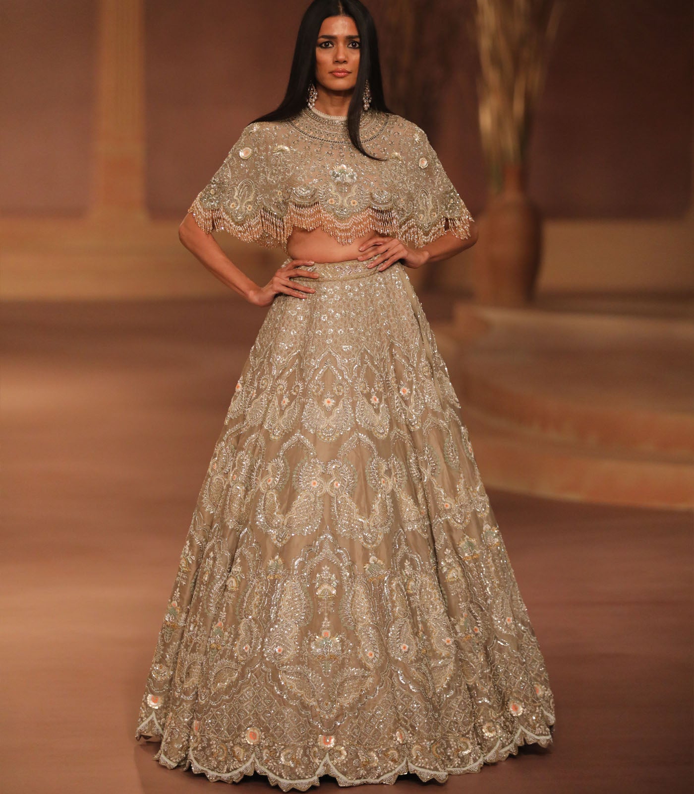Featuring a lehenga in organza base with cutdana embroidery. It is paired with an embroidered cape.