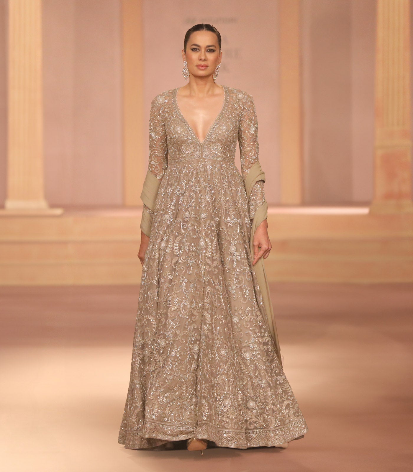 Featuring a gold anarkali in net base with threadwork embroidery. It is paired with a plain dupatta.