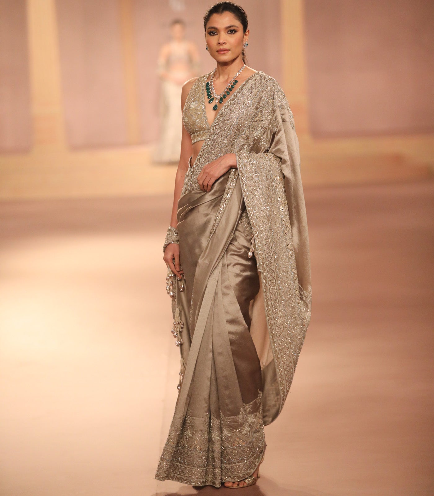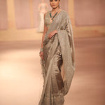 Featuring a gold saree in kora dupion base with gota embroidery. It is paired with an embroidered blouse.