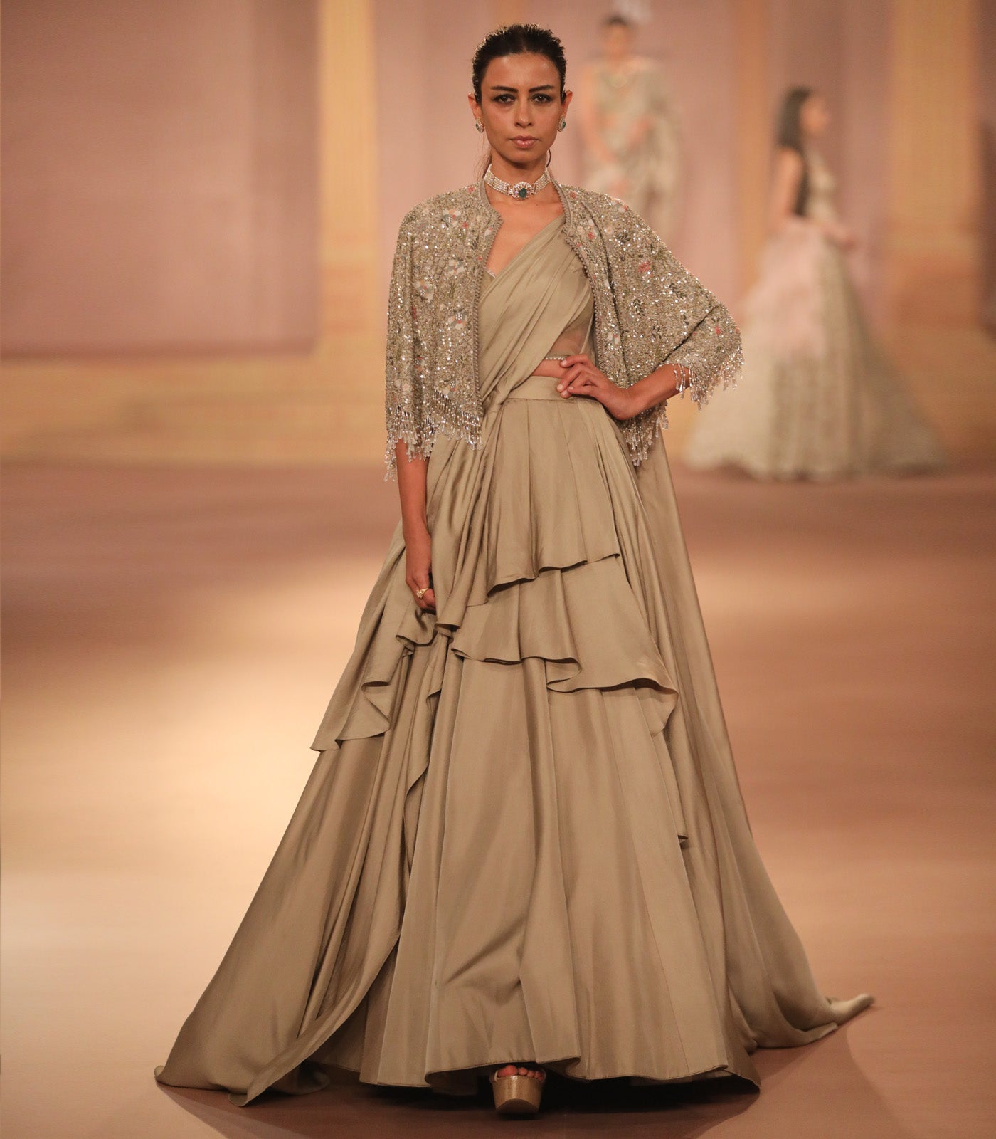 Featuring a gold pre-draped saree in twill base. It is paired with an embroidered cape and corset.