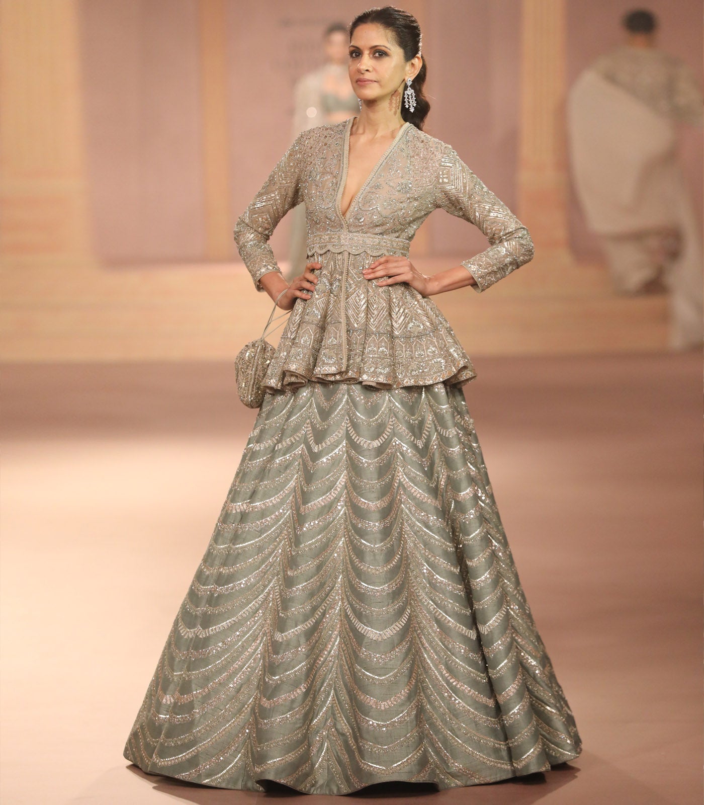 Featuring a lehenga in raw silk base with zari embroidery. It is paired with an embroidered peplum top.