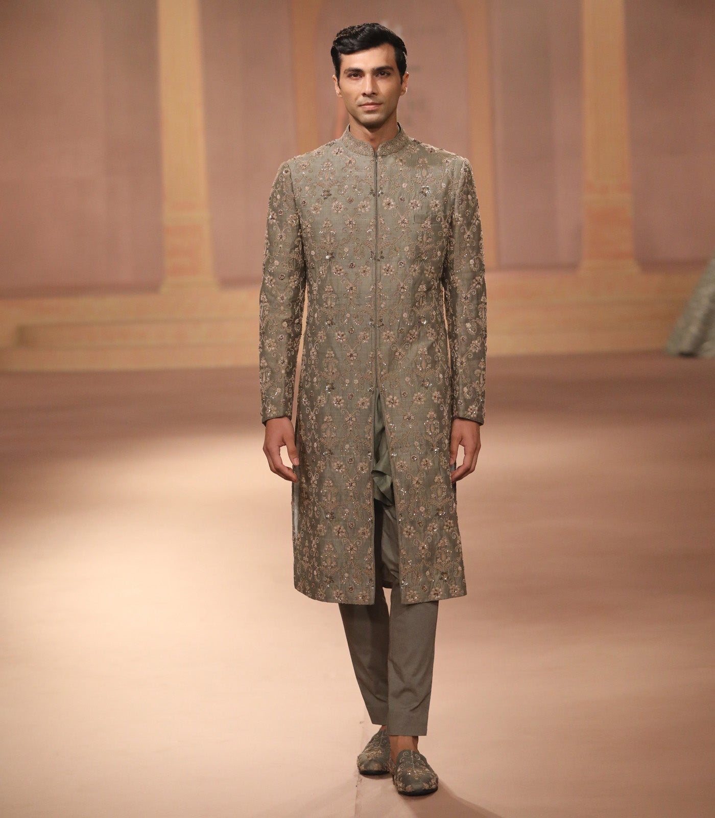 Featuring a mint sherwani in raw silk base with zardosi embroidery. It is paired with a kurta and pants.