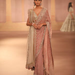 Featuring a peach saree in organza base with zari embroidery. It is paired with an embroidered blouse and dupatta.