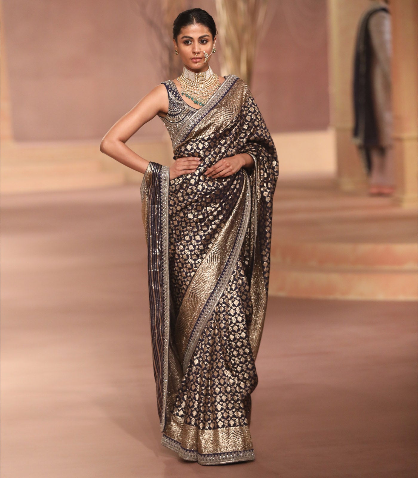 Featuring a purple saree in lurex banarasi silk base with zari embroidery. It is paired with an embroidered blouse.