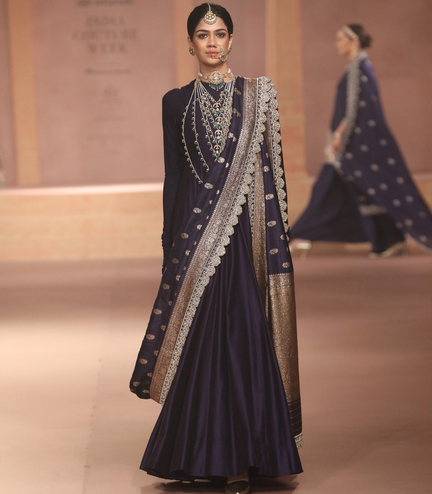 Featuring a purple plain anarkali in silk base. It is paired with an embroidered banarasi saree.