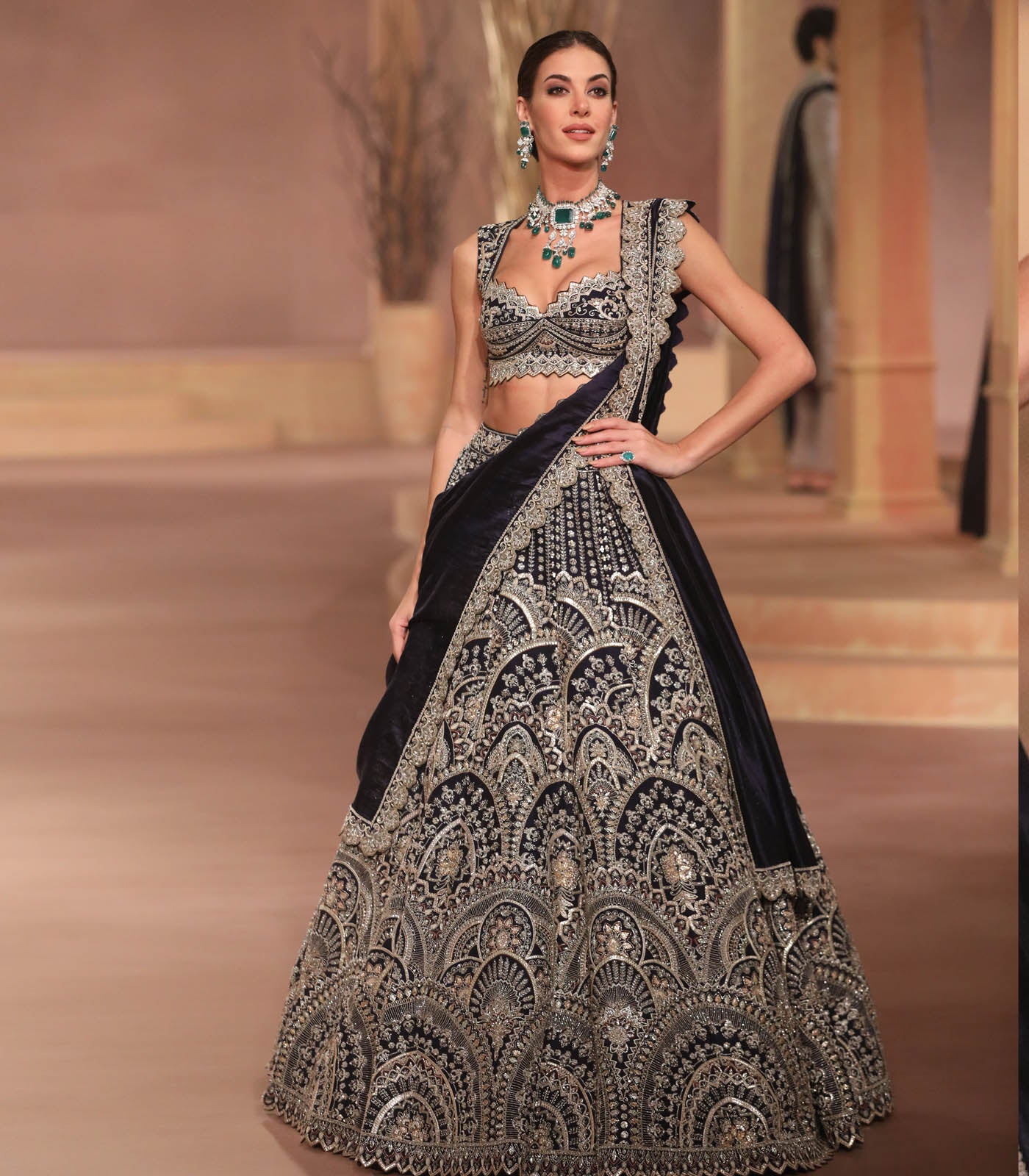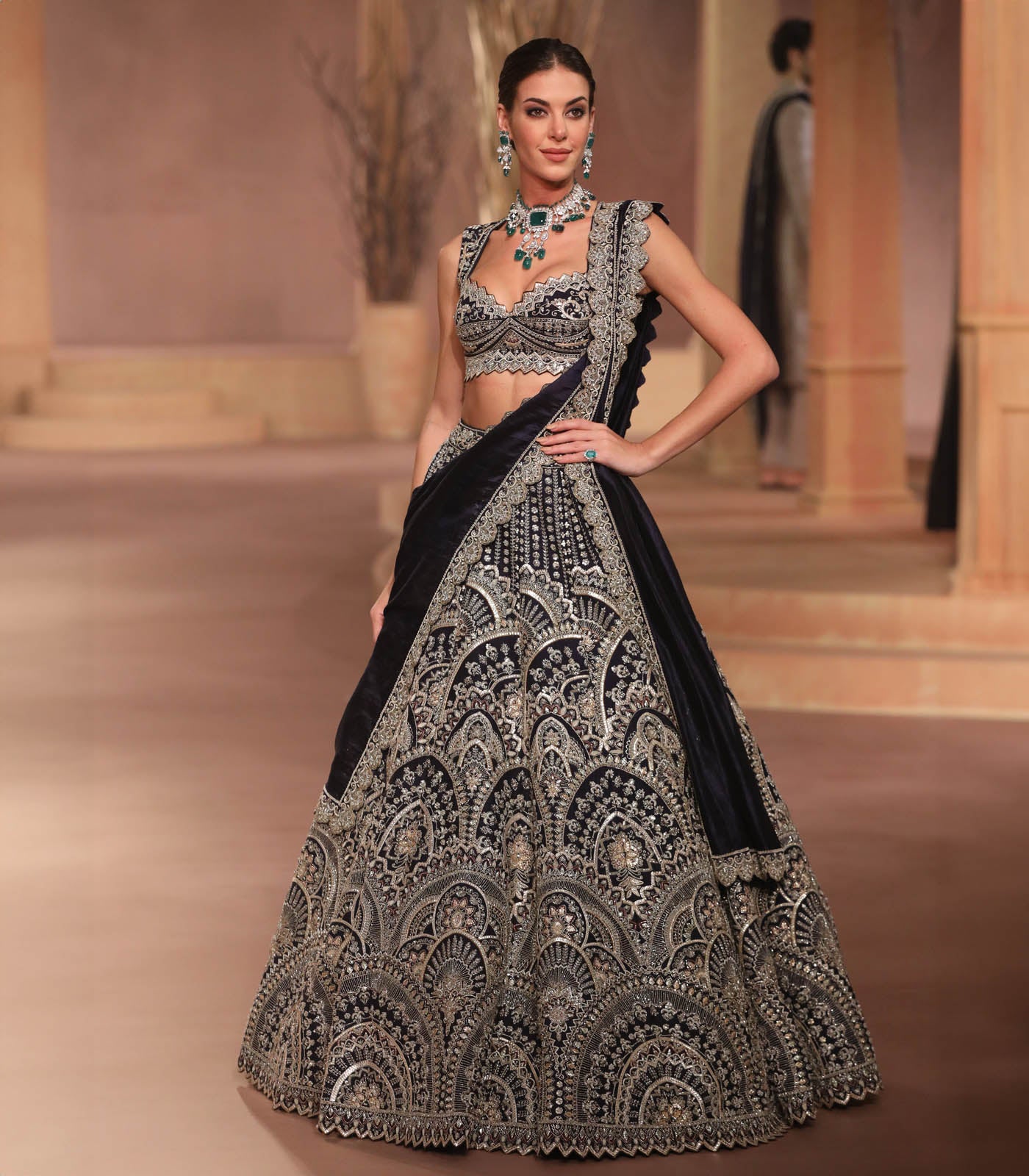 Featuring a lehenga in raw silk base with zari embroidery. It is paired with an embroidered blouse and a dupatta.