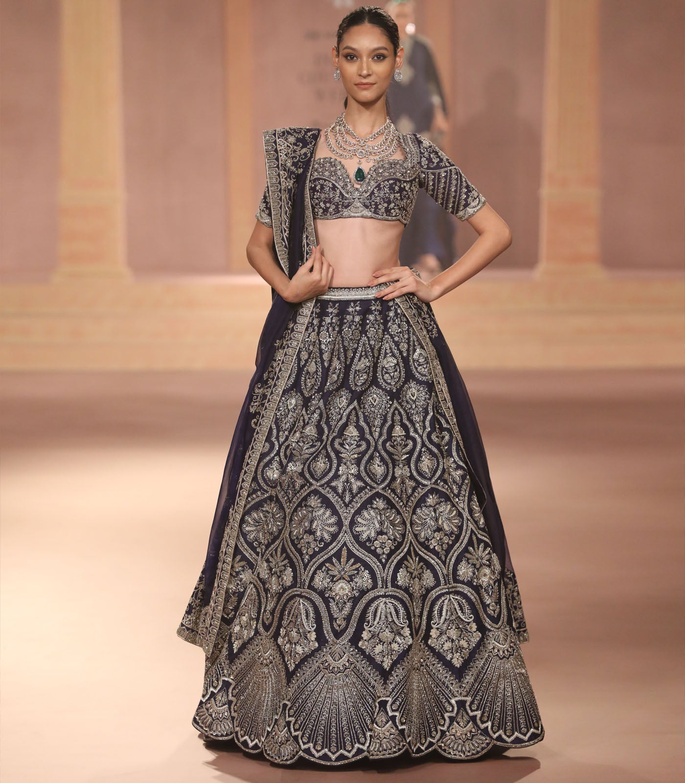 Featuring a lehenga in raw silk base with zari embroidery. It is paired with an embroidered blouse and a dupatta.