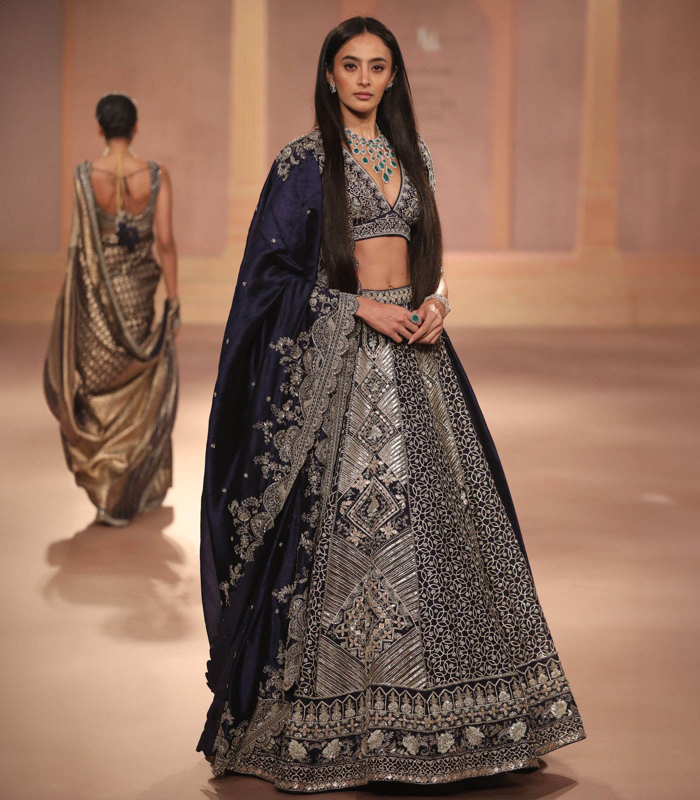 Featuring a lehenga in organza base with gota embroidery. It is paired with an embroidered blouse and a dupatta.