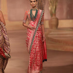 Featuring a pink saree in banarasi silk base with zari embroidery. It is paired with an embroidered blouse.