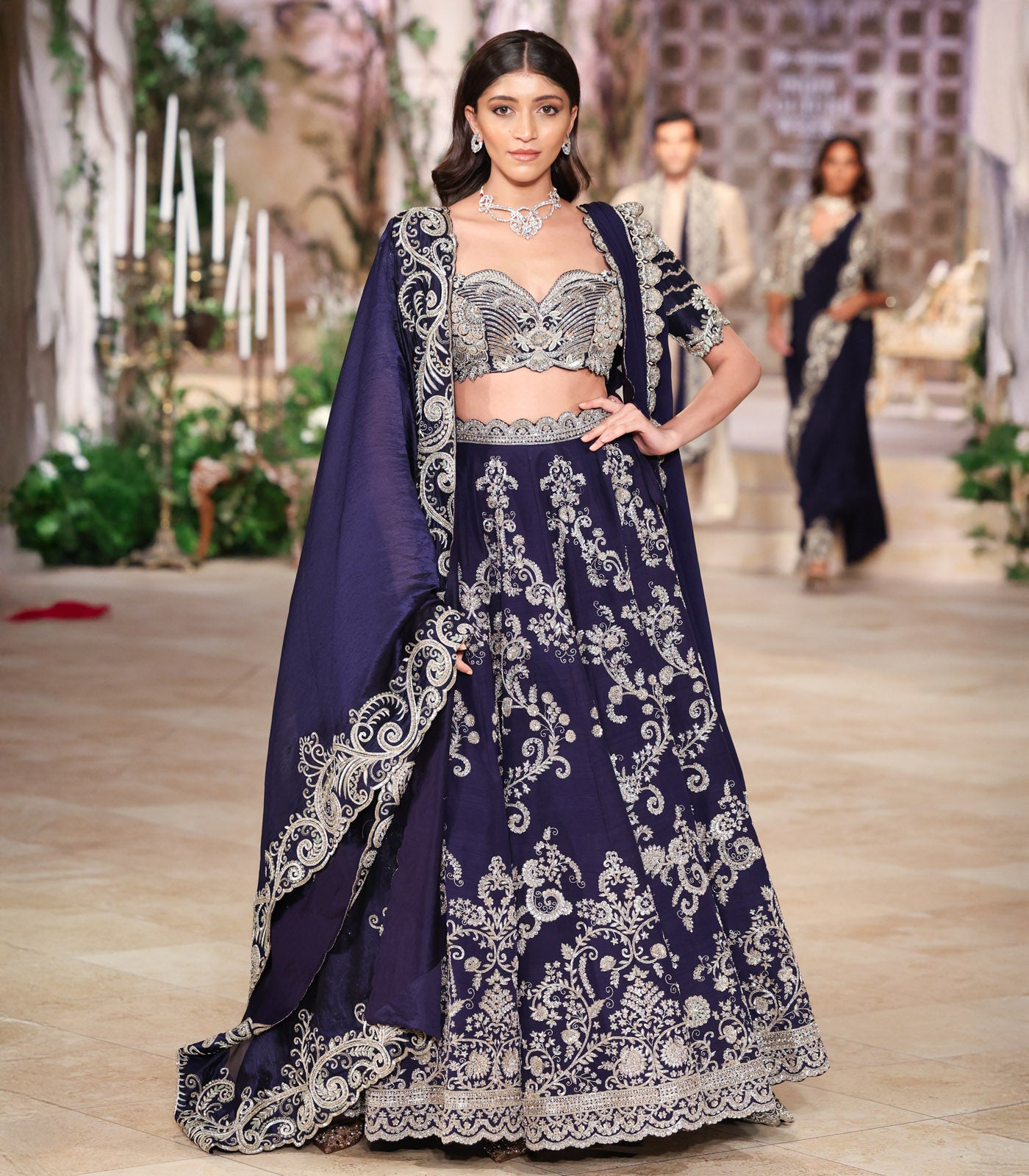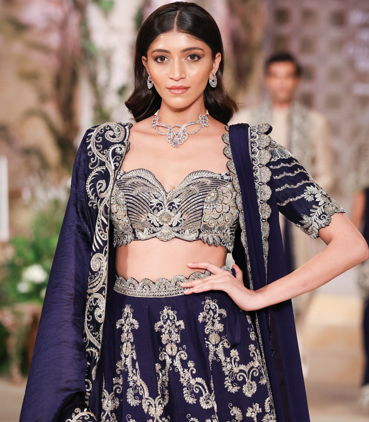 A lehenga paired with a blouse and dupatta, crafted on a raw silk base and intricately hand-embroidered in zardozi.