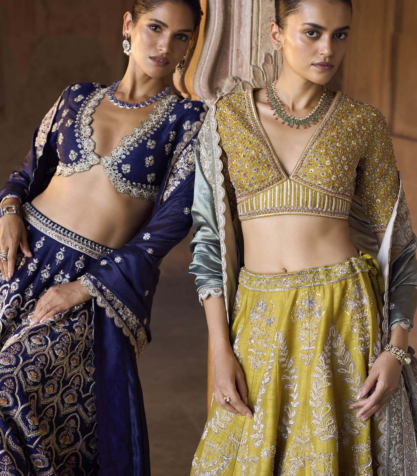 Featuring a lehenga in raw silk base with zardosi embroidery. It is paired with an embroidered blouse and a dupatta.