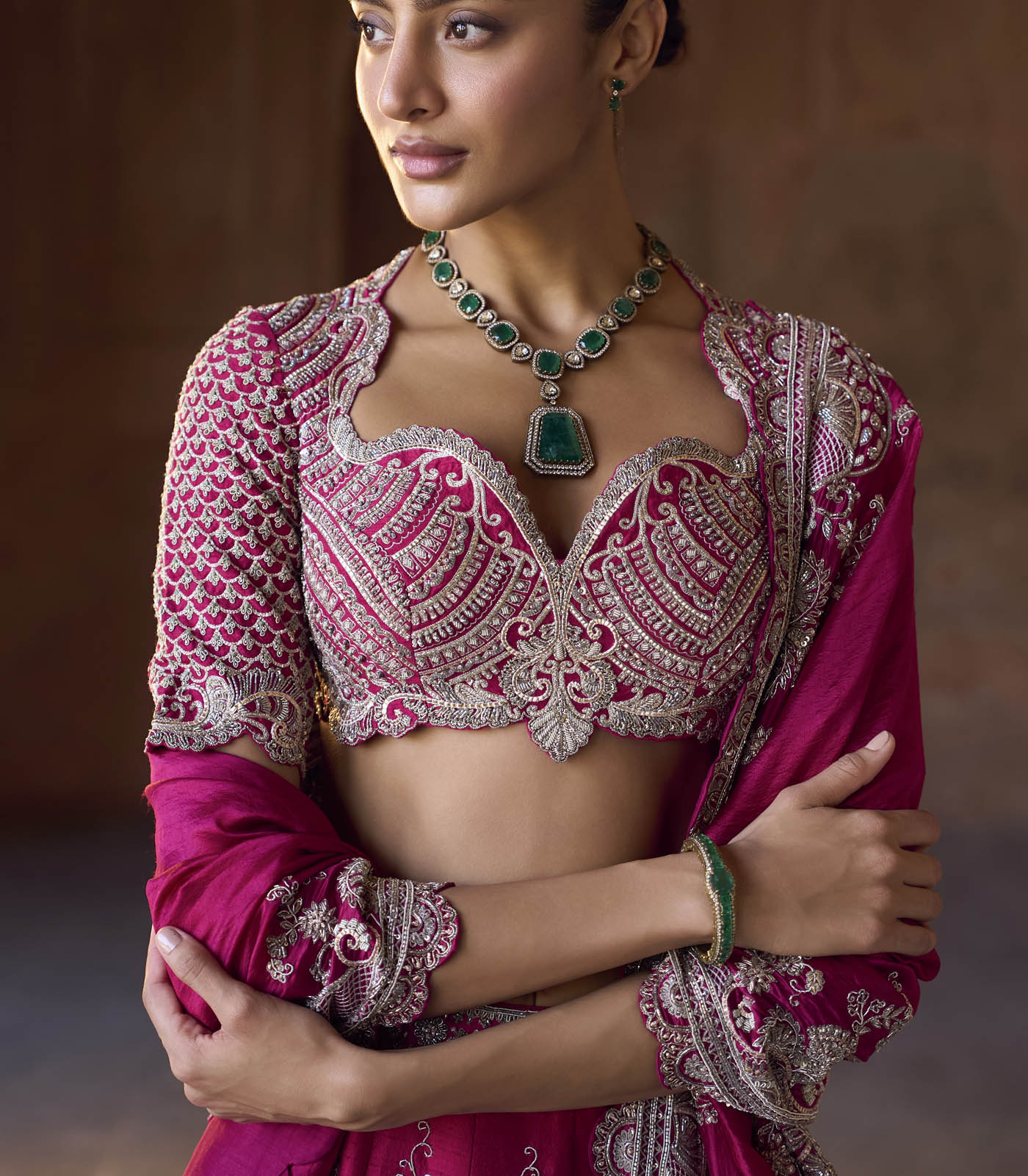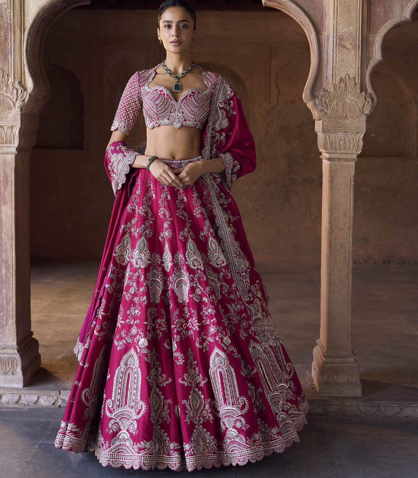 Featuring a lehenga in raw silk base with zardosi embroidery. It is paired with an embroidered blouse and a dupatta.