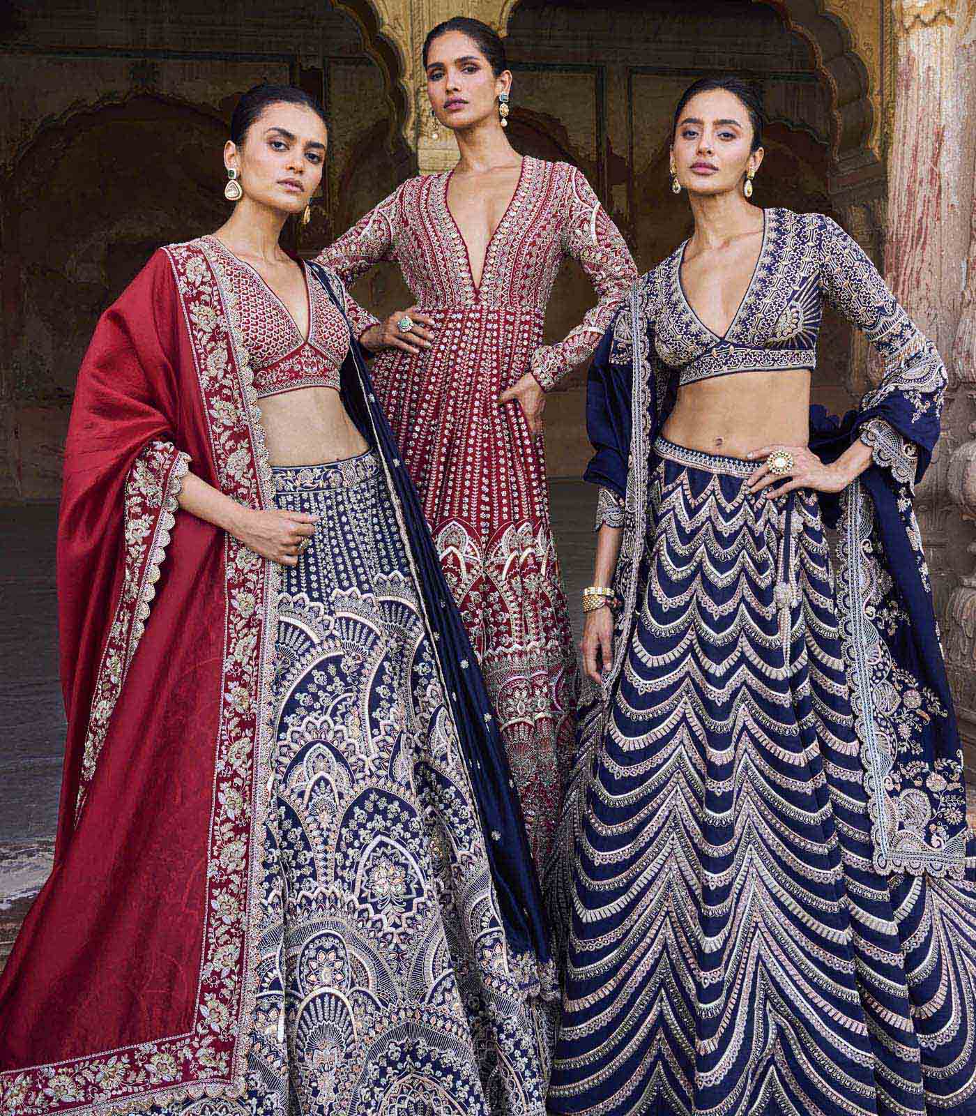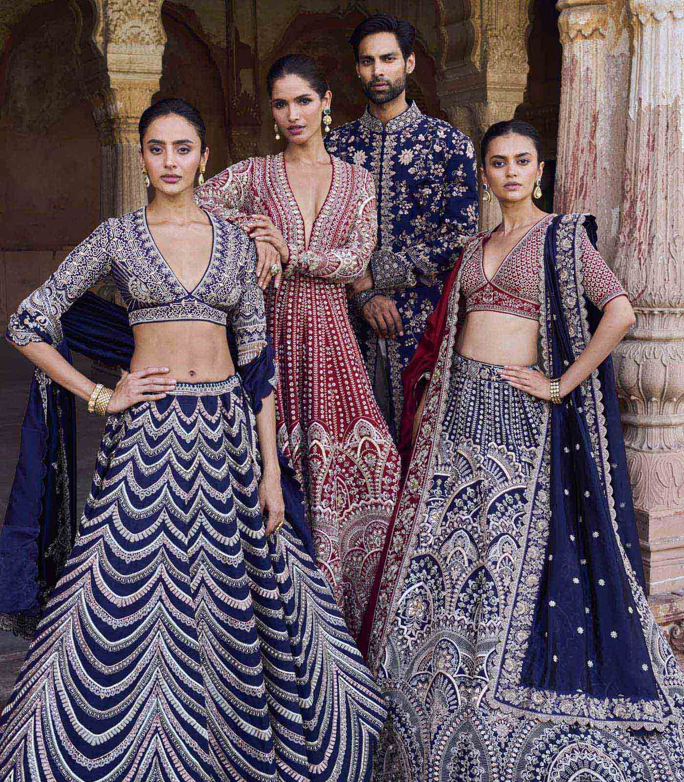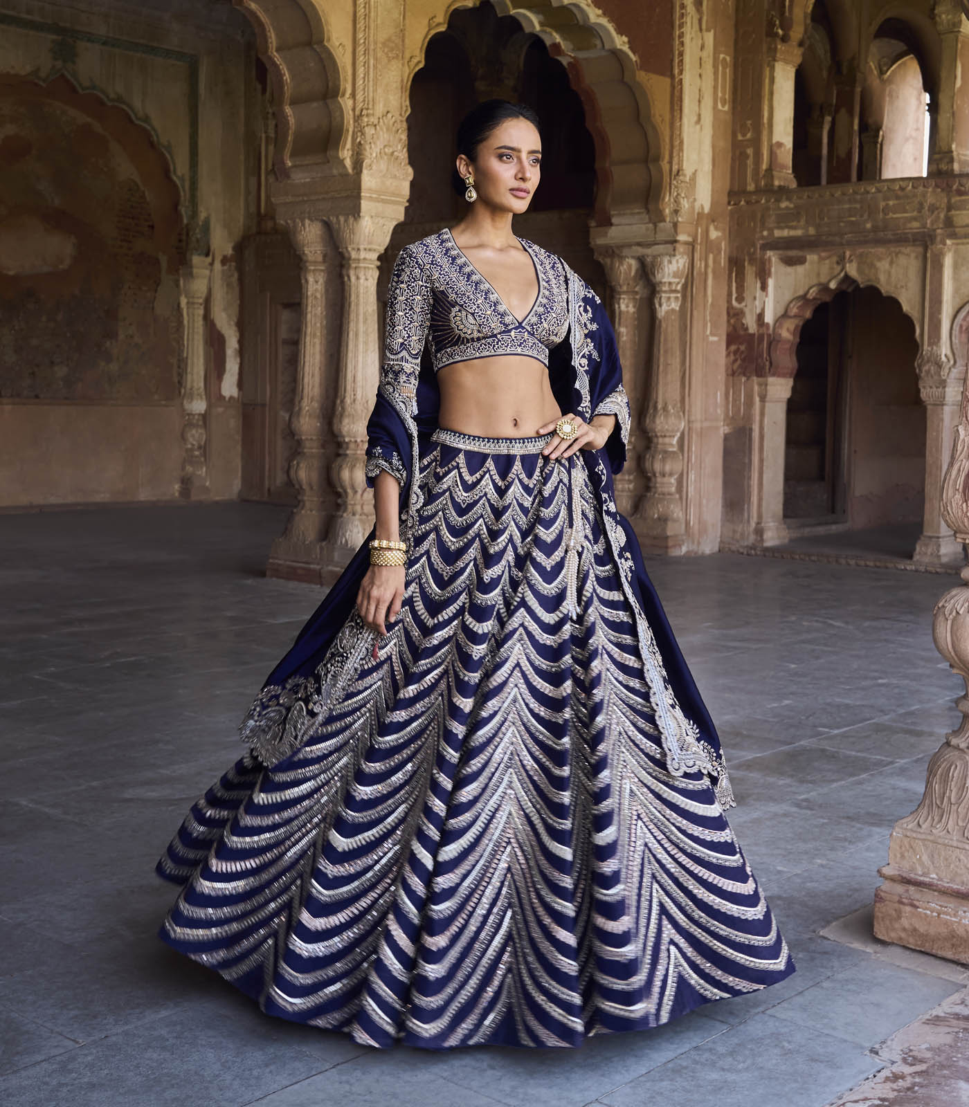 Featuring a lehenga in raw silk base with zardosi embroidery. It is paired with an embroidered blouse and a dupatta.