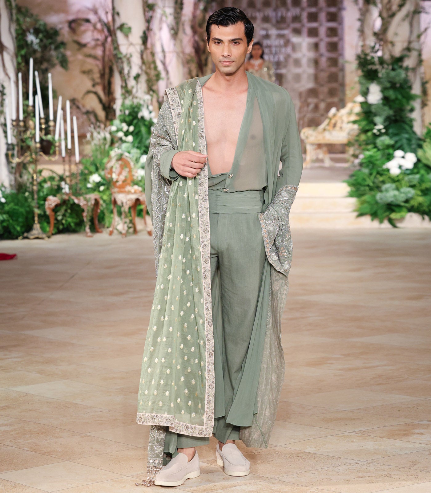 A shirt pant set paired with a jacket, dupatta and belt crafted on a georgette base and intricately hand-embroidered in zardozi.