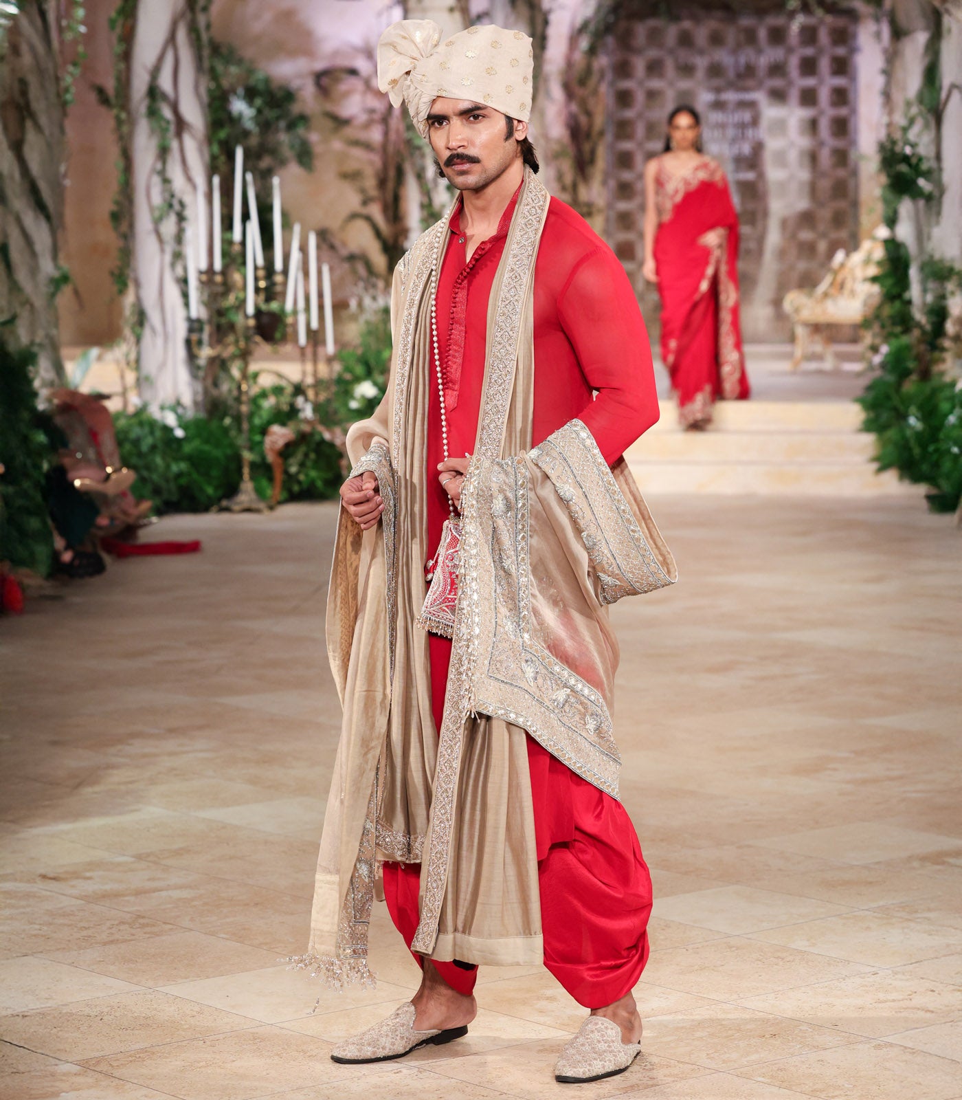 A kurta-dhoti set paired with dupatta crafted on a georgette base and intricately hand-embroidered in zardozi.