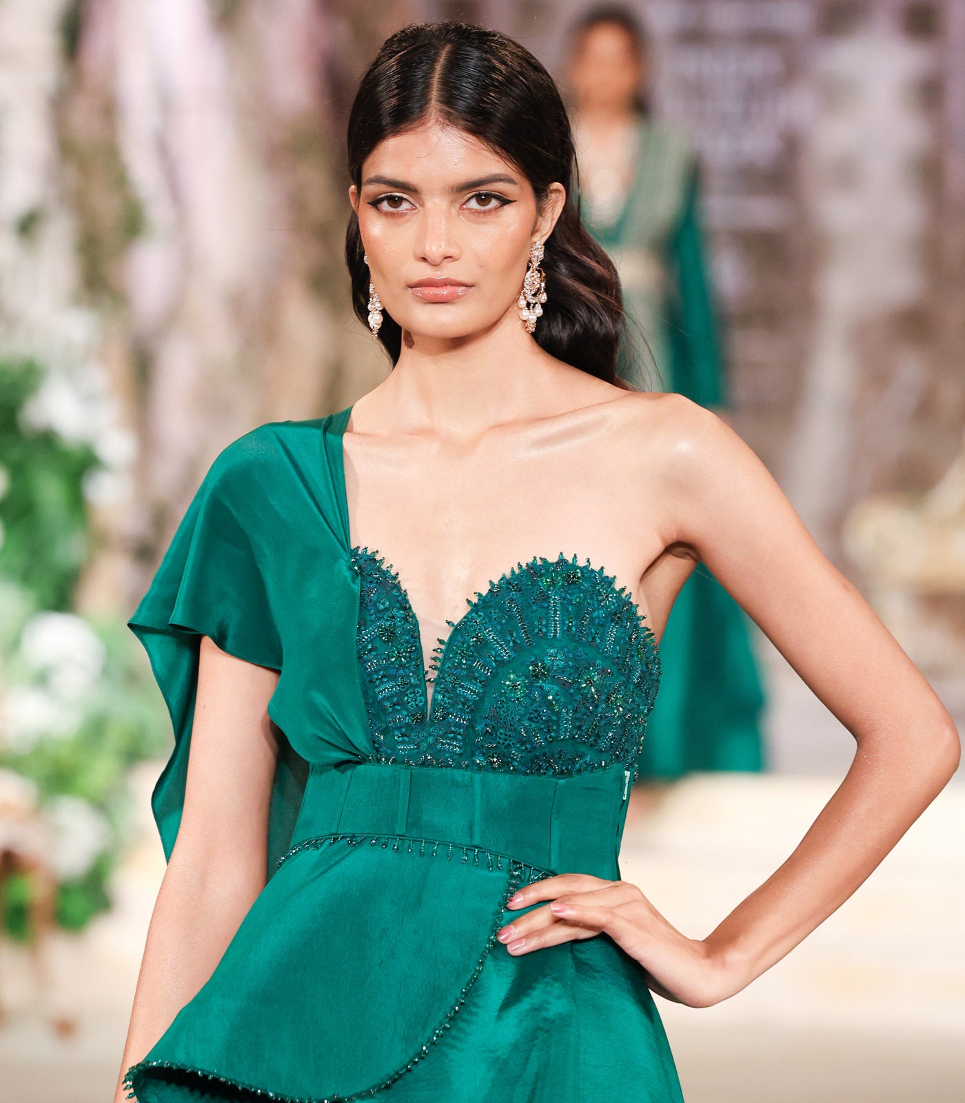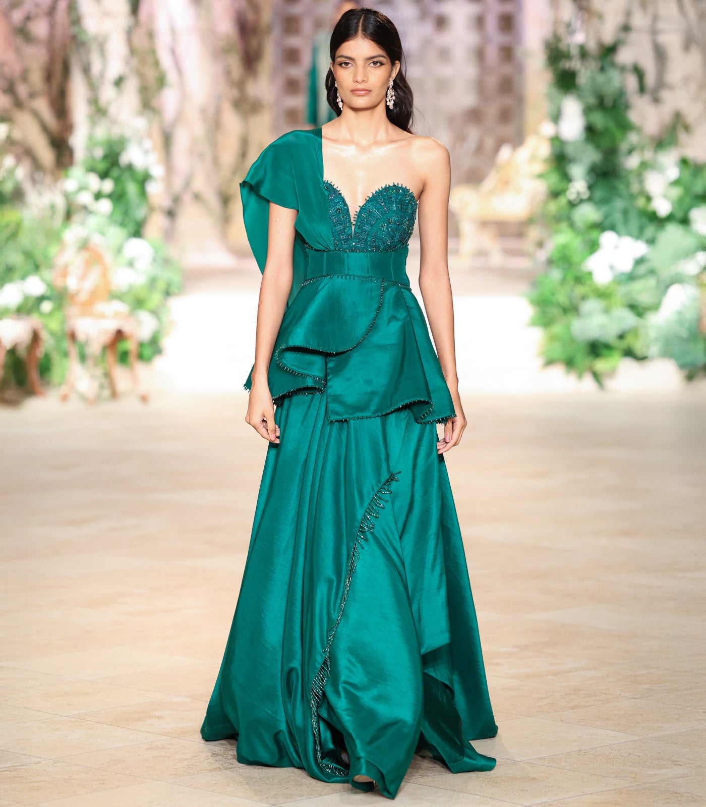 A drape gown, crafted on a silk base and intricately hand-embroidered in threads & beads.