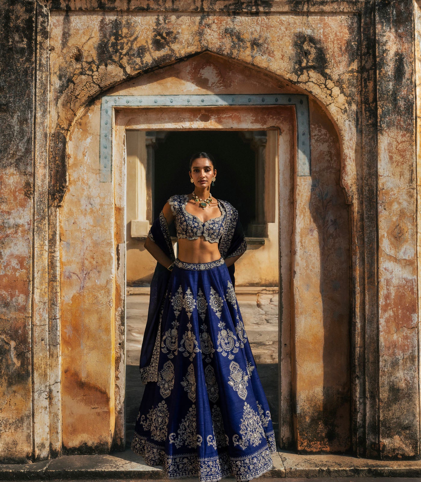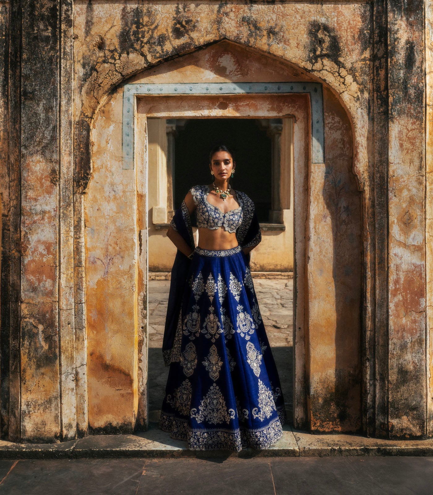 A lehenga paired with a blouse and dupatta, crafted on a raw silk base and intricately hand-embroidered in zardozi