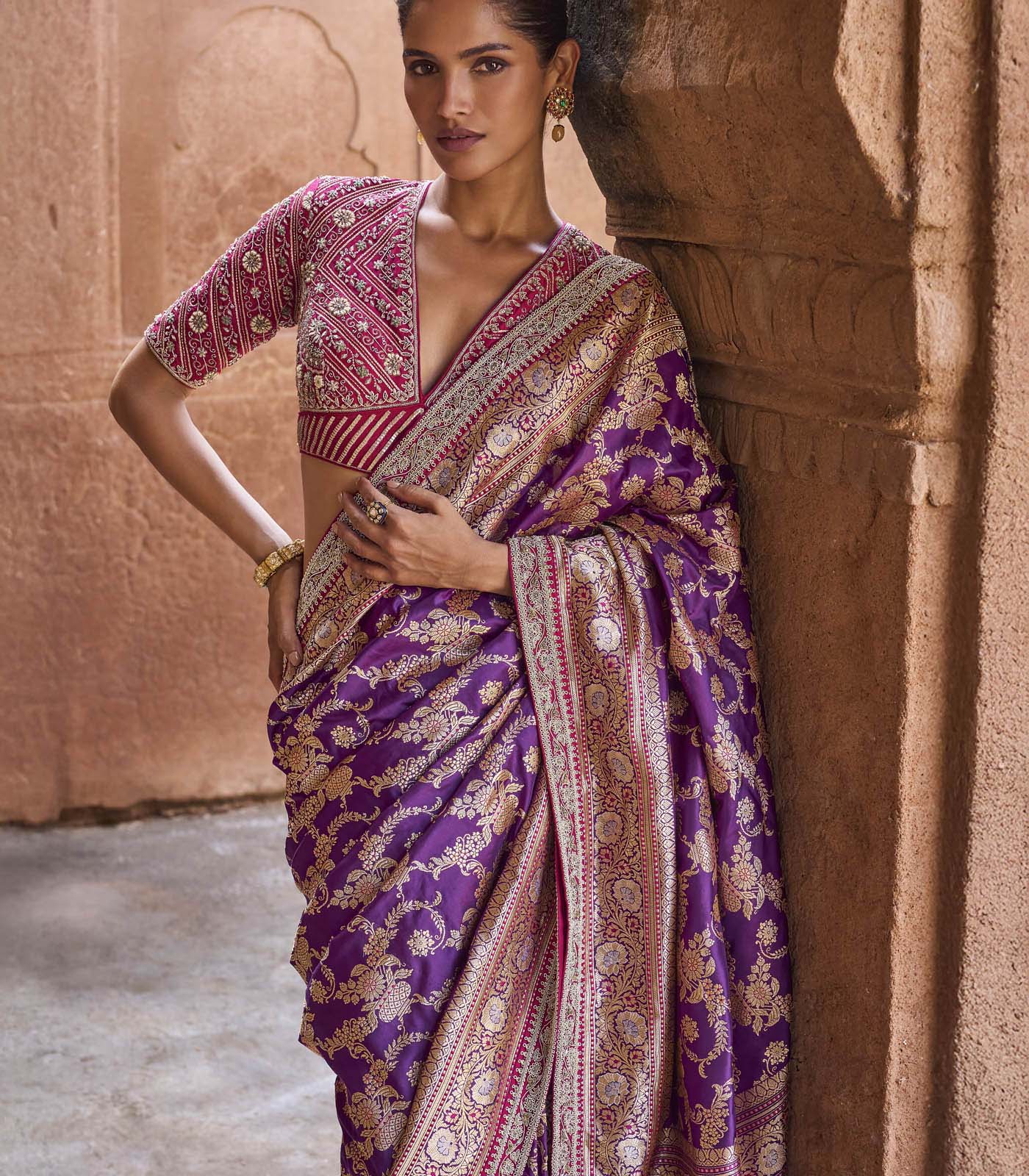 Featuring a banaras saree with zardoise embroidery. It is paired with an embroidered blouse.