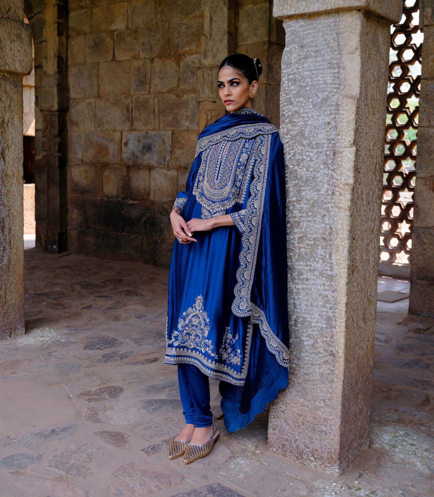 Featuring a tunic in silk base with zardosi embroidery. It is paired with an embroidered dupatta and a plain chudidar.