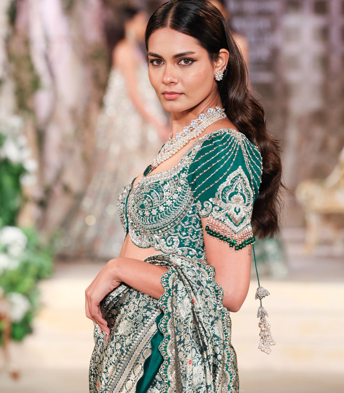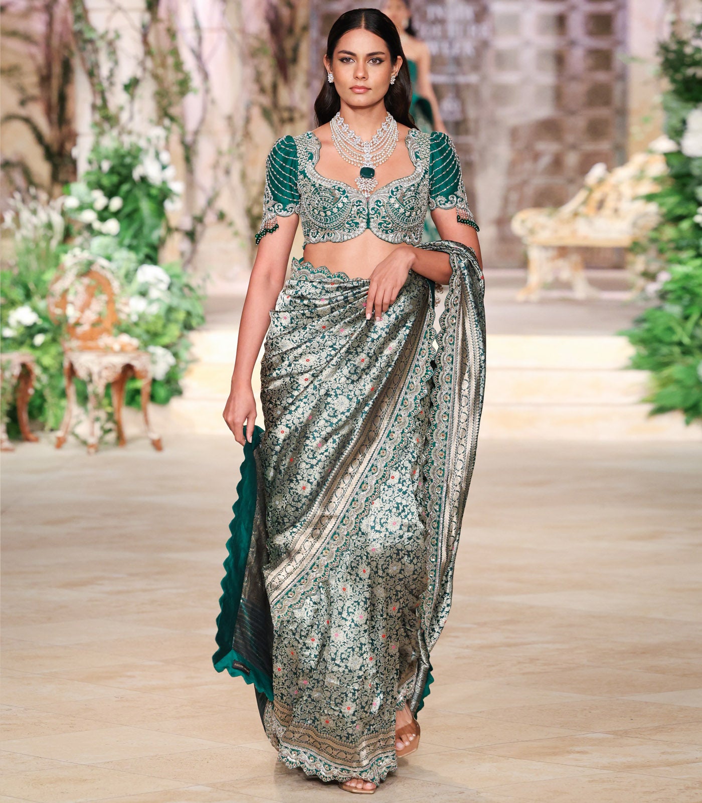 A banarasi saree paired with a blouse, crafted and intricately hand-embroidered in zardozi.