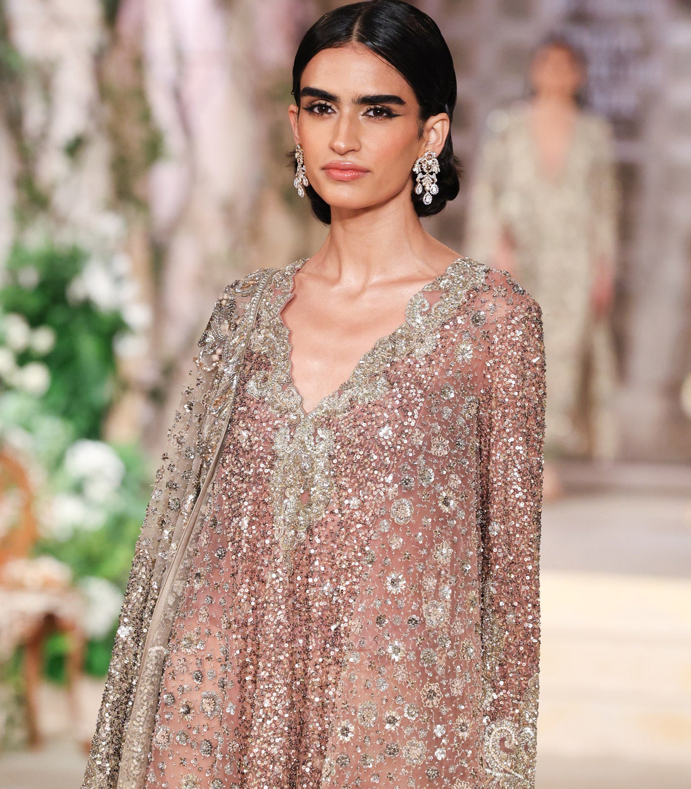 A kurta paired with a cape and pants, crafted on a net base and intricately hand-embroidered in sequins.