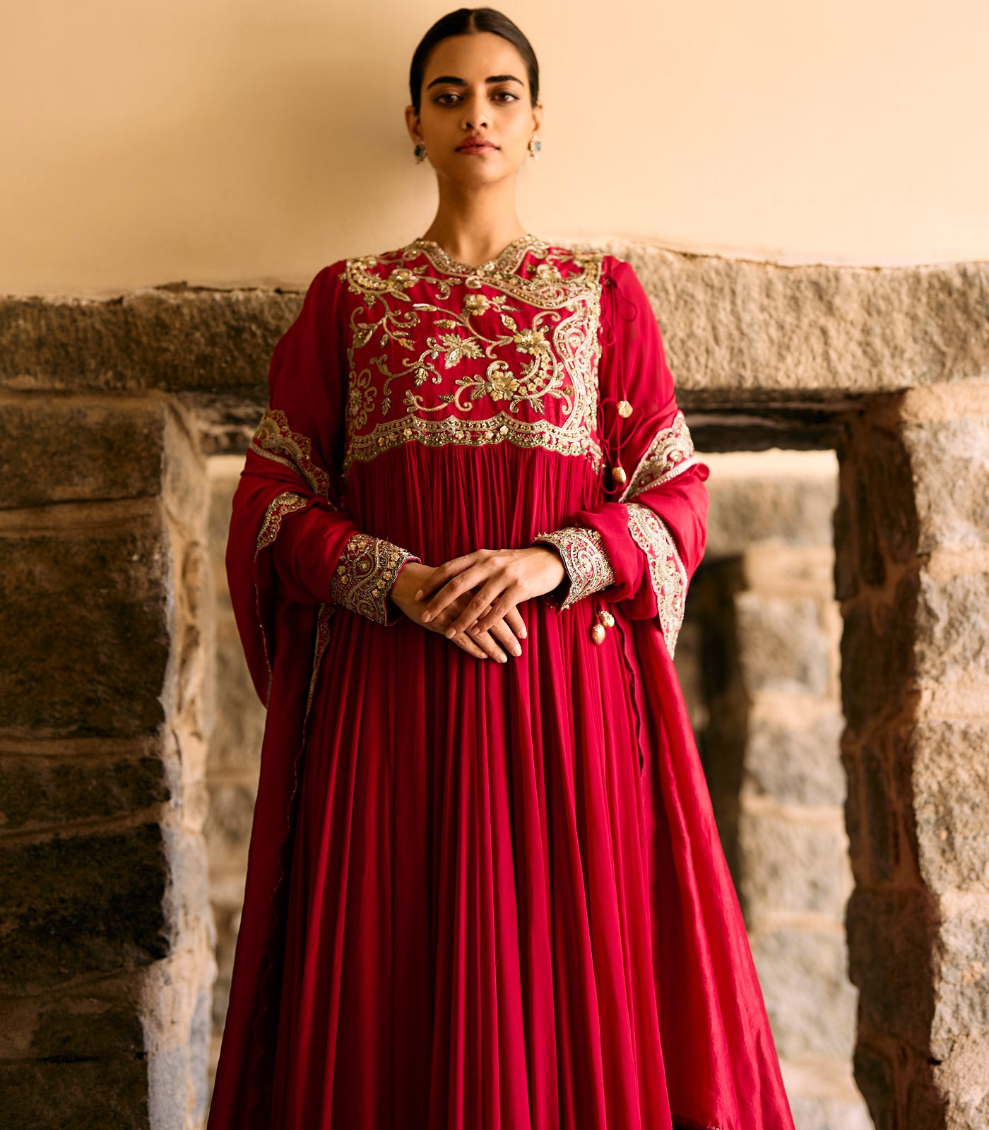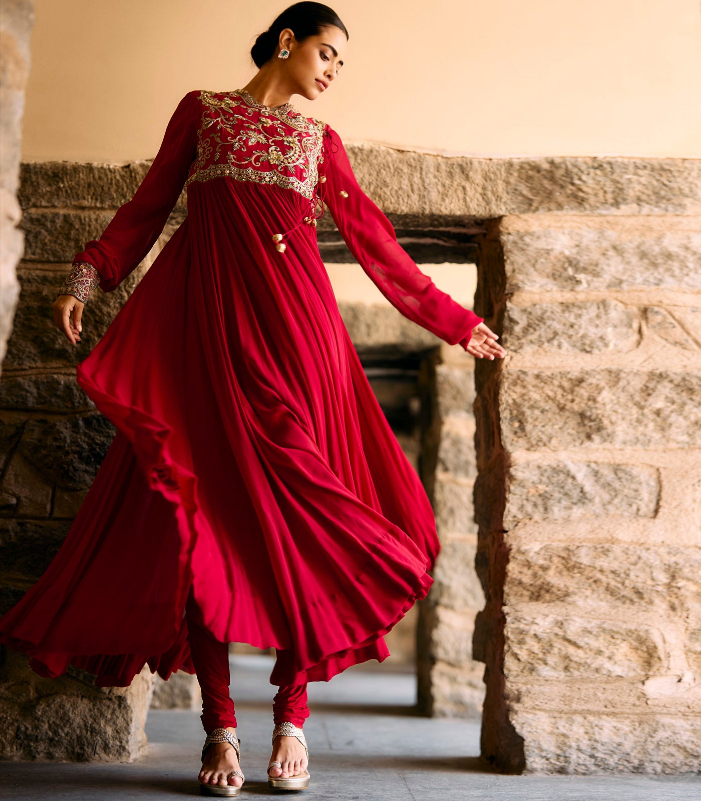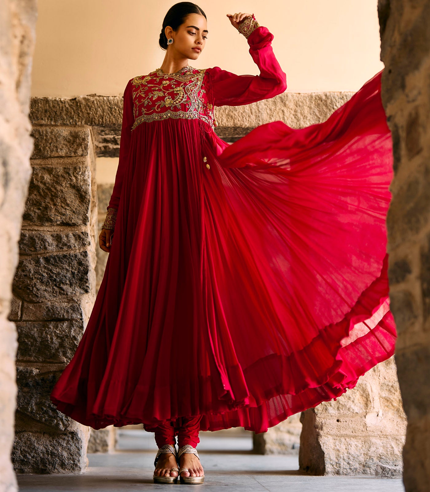 Featuring an anarkali in raw silk base with zardosi embroidery paired with plain chudidar.