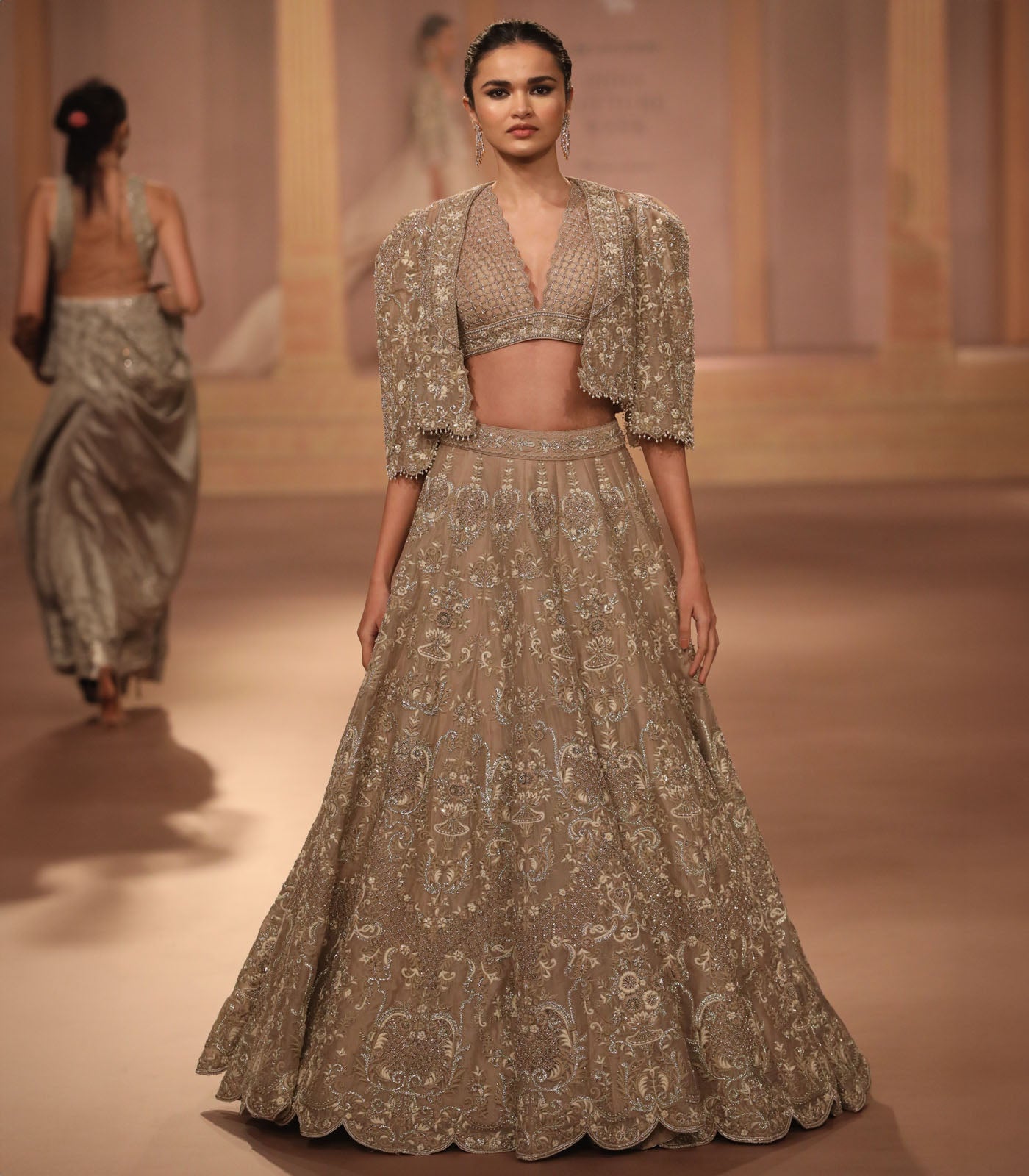 Featuring a lehenga in organza base with threadwork embroidery. It is paired with an embroidered bustier and short jacket.
