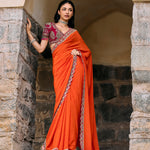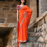 Featuring a saree in silk base with hand embroidered border paired with a zardozi embroidered blouse.