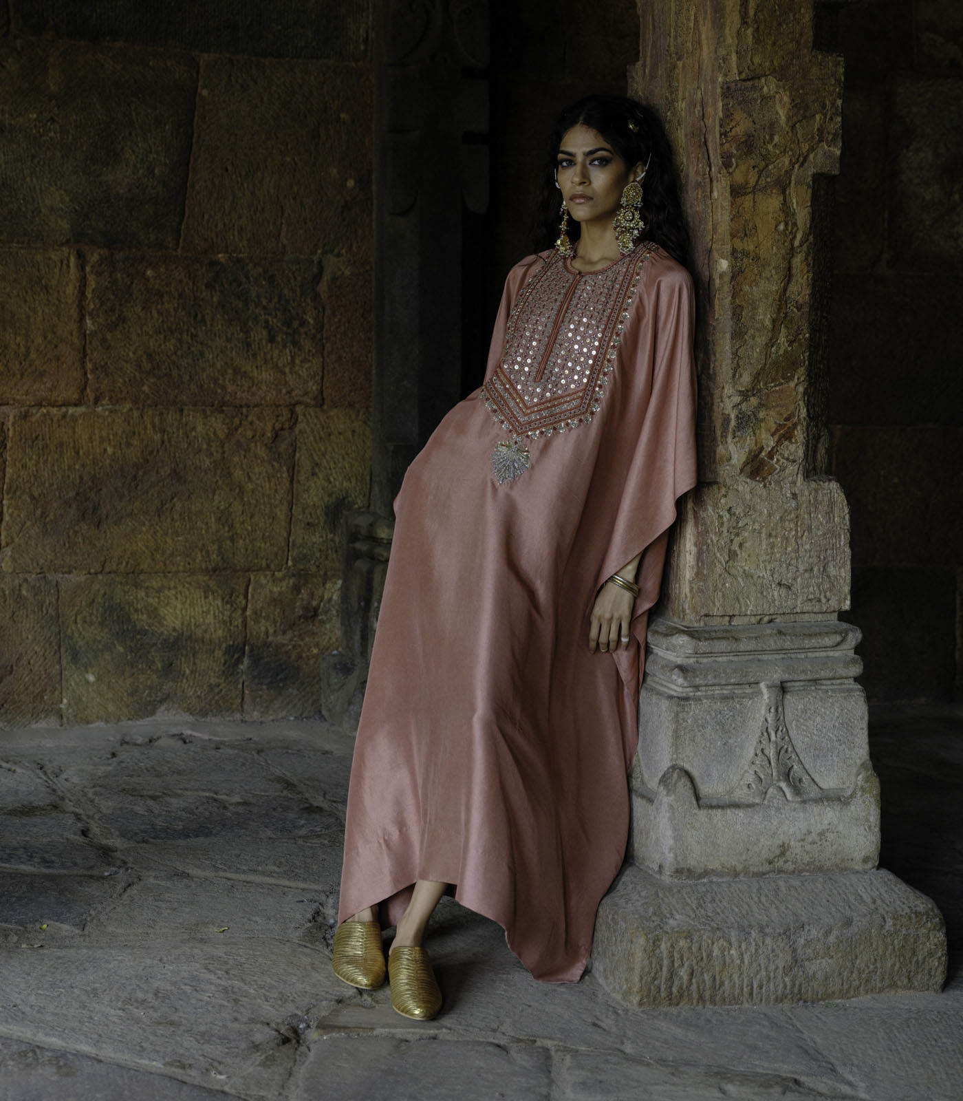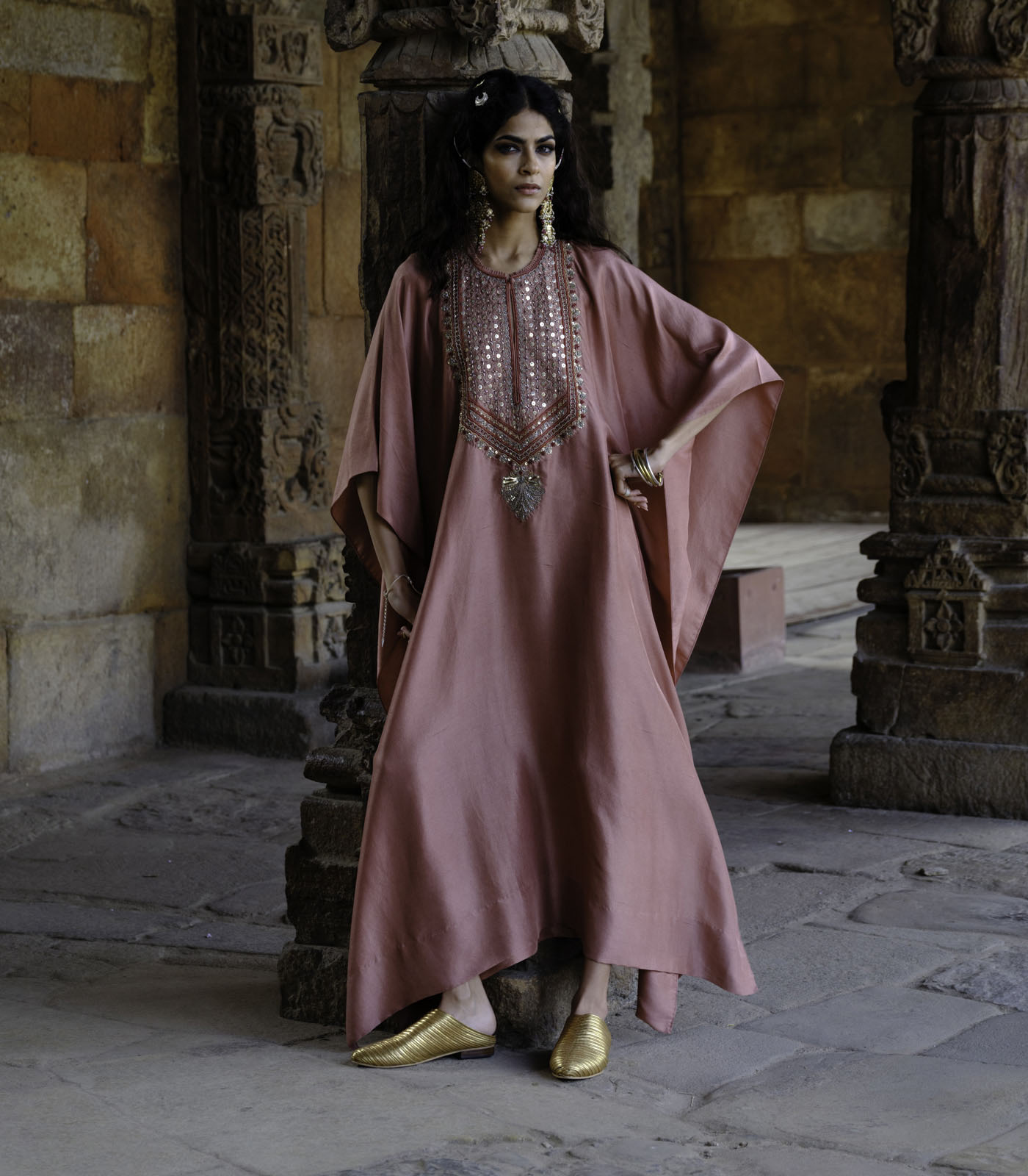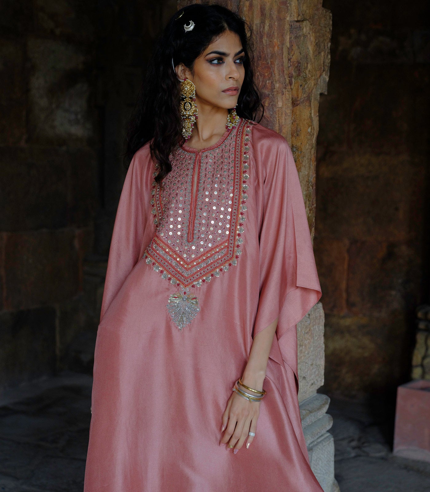 Featuring a kaftan in silk base with zardosi embroidery.