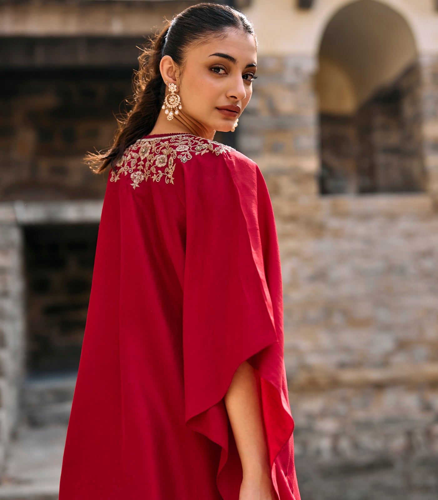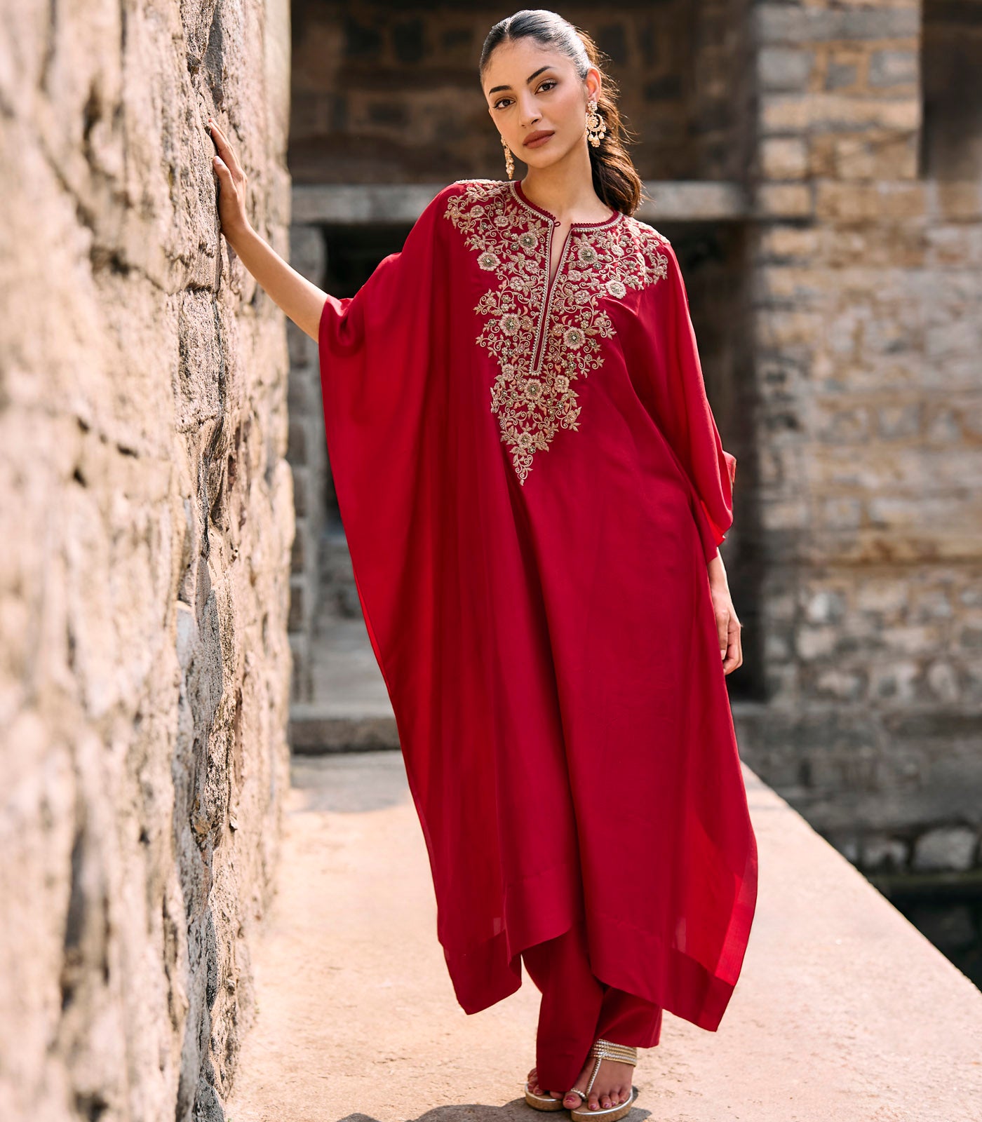 Featuring a kaftan in silk base with threadwork embroidery paired with pallazo.